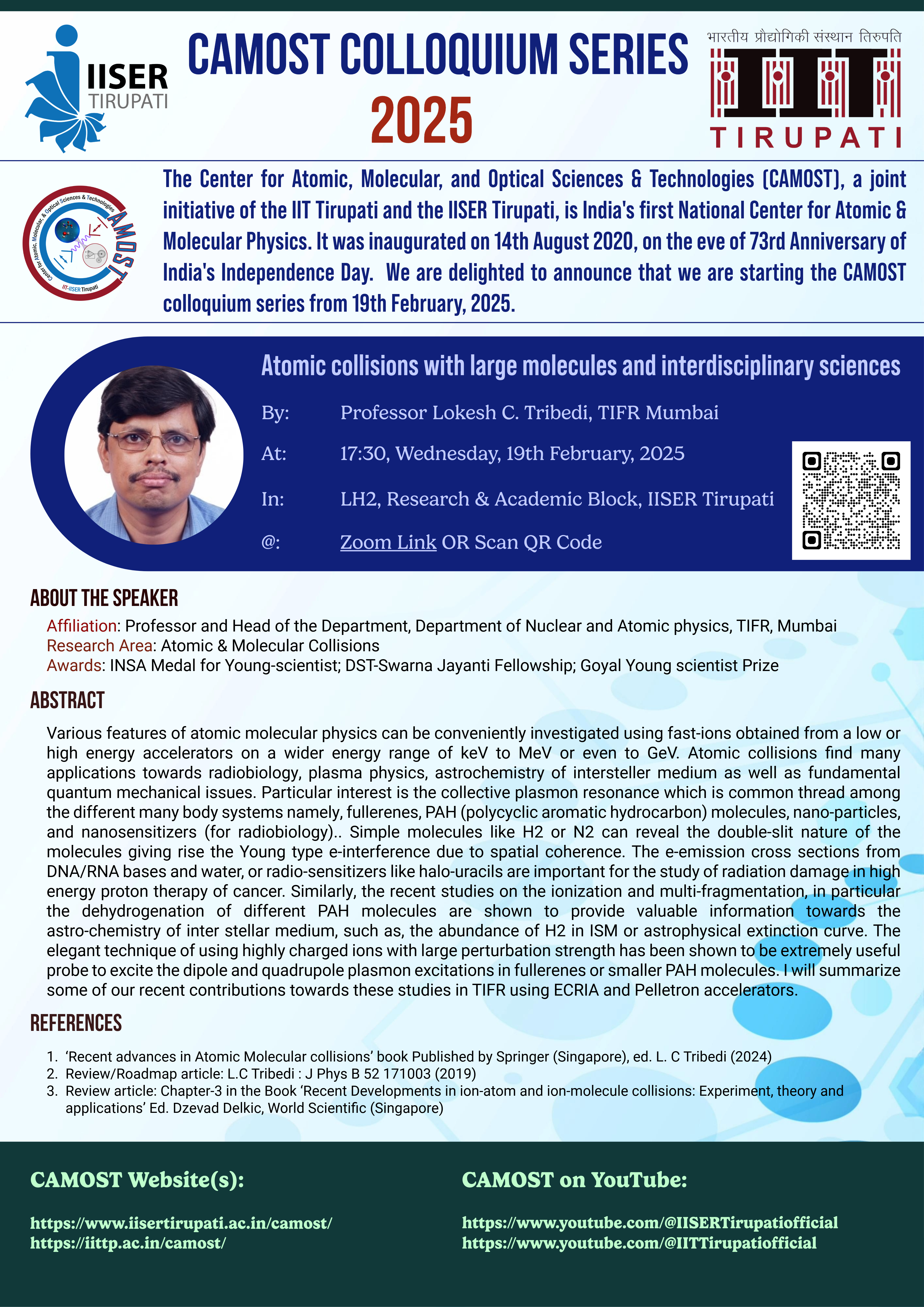 The Center for Atomic, Molecular, and Optical Sciences & Technologies (CAMOST), a joint initiative of the IIT Tirupati and the IISER Tirupati, was inaugurated on the eve of the 73rd anniversary of India's Independence Day by Dr. Arabinda Mitra (Scientific Secretary, Office of the Principal Scientific Advisor, Government of India). We are delighted to inform you that CAMOST's Colloquium Series 2025 is commencing with the Colloquium by Professor Lokesh Tribedi, TIFR, Mumbai, at IISER Tirupati on 19th February 2025. The details can be found below.