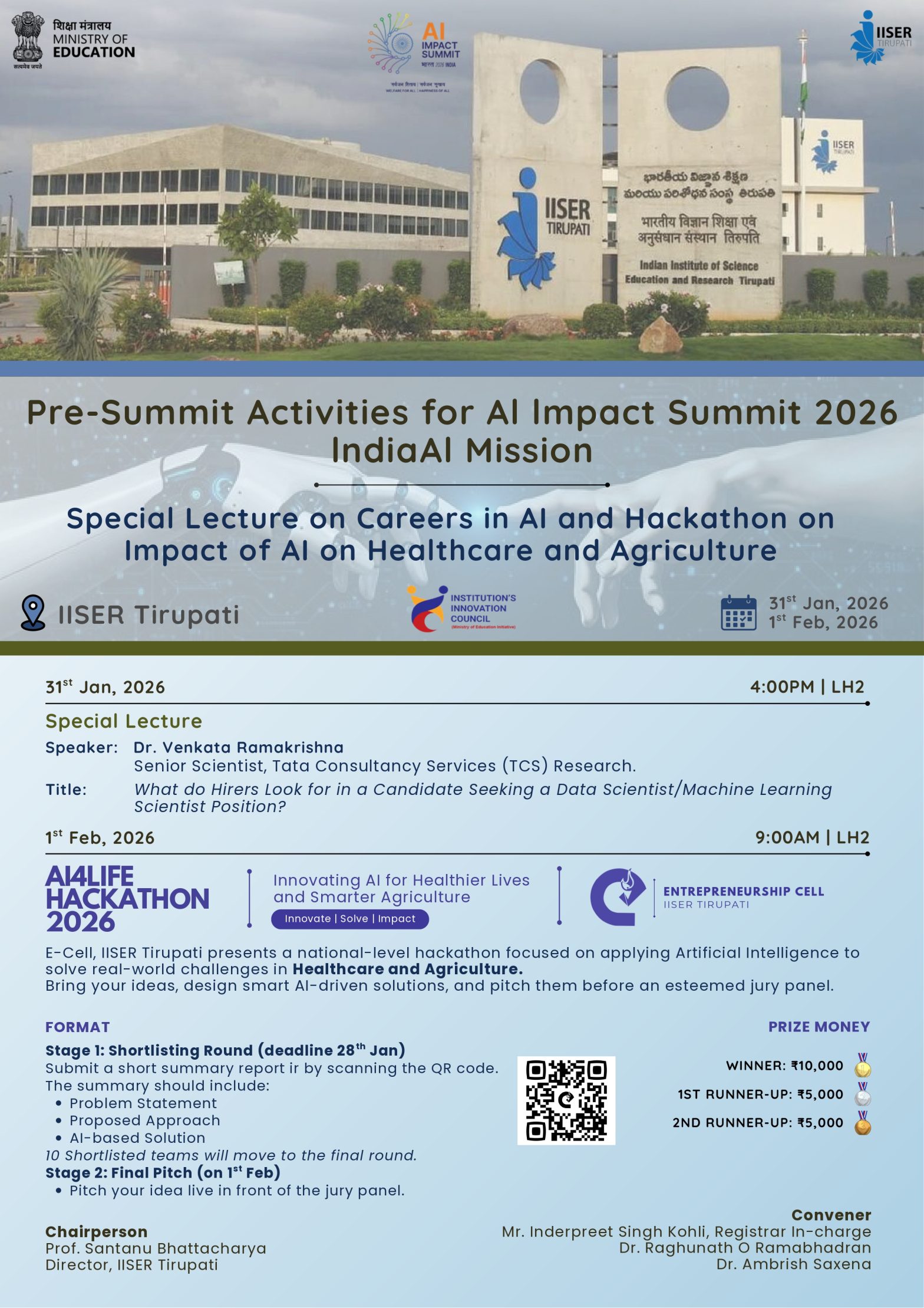 Pre-Summit Activities for Al lmpact Summit 2026 lndia Al Mission Venue: IISER Tirupati, LH2 Date and Time: 31st Jan, 2026, 4 PM 1st Feb, 2026, 9 AM Click here for more details