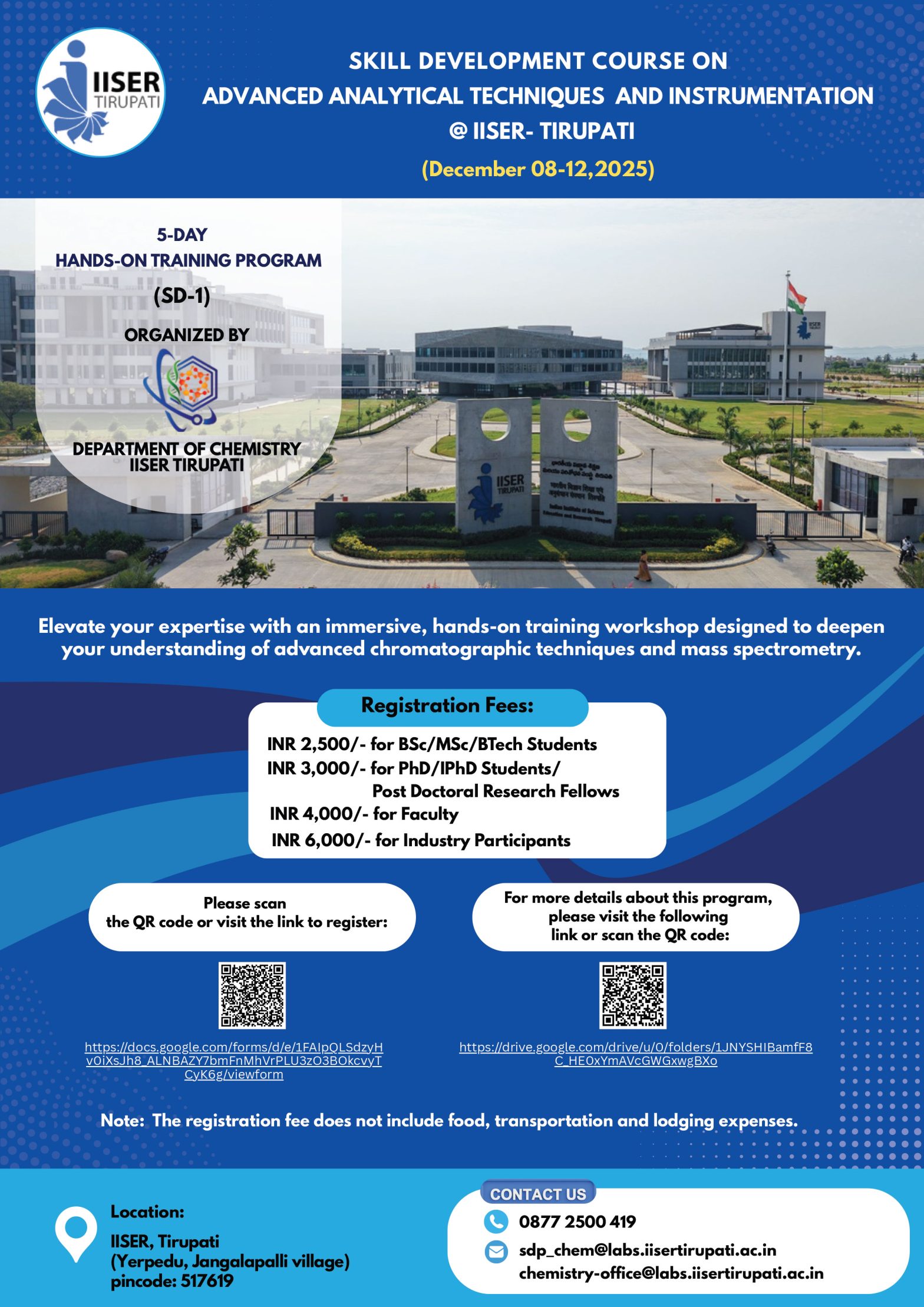 The Department of Chemistry at IISER Tirupati is set to launch its first “Skill Development Program” in December 2025. Click Here for Flyer Click Here for Details